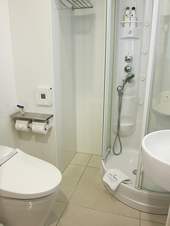 櫃檯小姐竟然會唸我中文姓名的日文發音,讓我有點驚訝,事後回想應該是當初訂房時留下的。房間一如其他平價商務飯店,小到極致,照片中衛浴空間看起來比實際使用感覺大,特地選擇淋浴間房型,因為不喜歡又深又小的浴缸,每次洗澡踏進踏出都覺得自己在參加跨欄比賽。大概由於日本人習慣泡澡,飯店幾乎都設浴缸,有淋浴間房型的飯店極少,多付幾倍價錢是可以住到兩者皆有的星級飯店啦。淋浴間小到轉身都難,洗一次澡不知道要撞幾次。