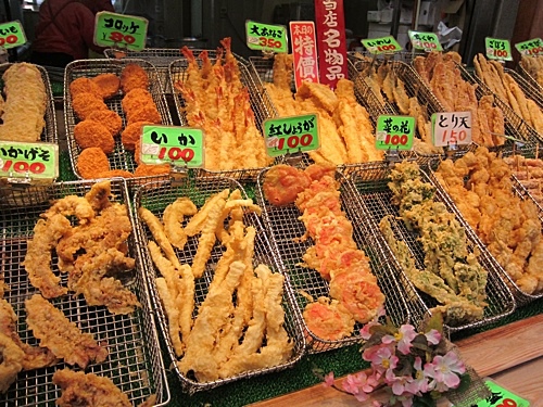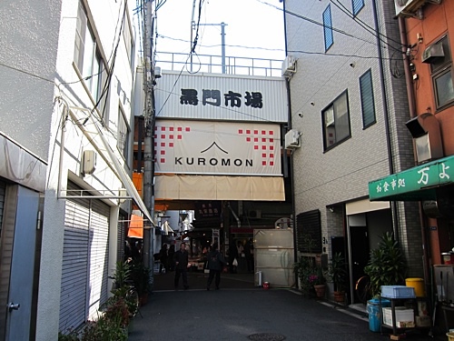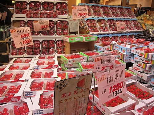 隔天隨便走進一家連鎖店吃日式早餐,買好餐券坐吧台,一早就吃米飯不太習慣。接著前往黑門市場,逛市場是一定要的,有得吃有得買,擠滿當地人好不熱鬧。一家超市門口擺滿日本各地草莓,鮮紅欲滴好誘人,這麼大的陣仗生平頭一回見,立刻挑一盒,店小人多,每個結帳櫃檯都是人潮,看著別人菜籃裡的東西,想像他們家餐桌上的菜色。