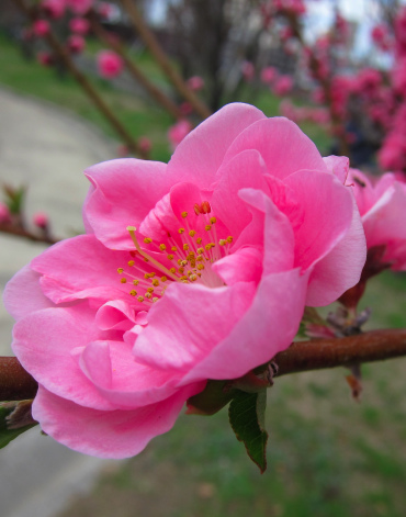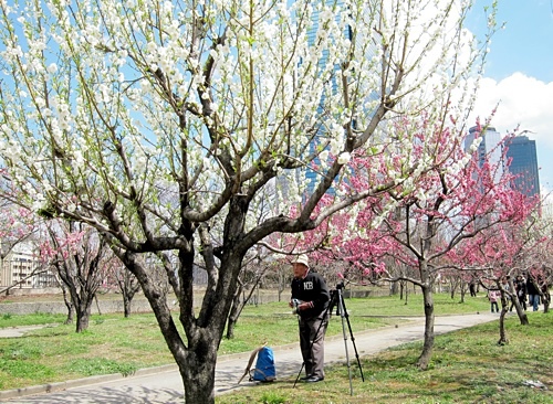 走著走著,前方忽見奼紫嫣紅,興奮的加緊腳步趨近,雖然美得很,但不是櫻花,我一看就知道是桃花,可是爸爸不死心的指著花問了一位日本太太,Sakura?對方回答是Momo,緊接著聊了起來。爸爸的日語能力很有限,偏偏喜歡和人搭訕,我站在幾公尺外邊拍花邊等著看好戲,結果爸爸居然招手要我去翻譯,然後日本太太的先生回來了。
