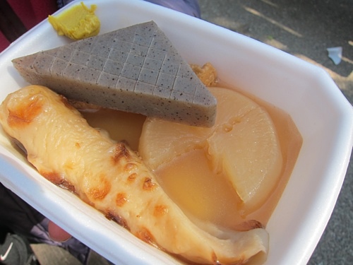 廣場邊聚集成排攤販,隨便挑了一家買關東煮,暖暖身子解解饞。結果意想不到的美味,湯汁鮮美,煮物柔軟入味,令人意猶未盡。只不過隨便選一攤,也能有如此水準。