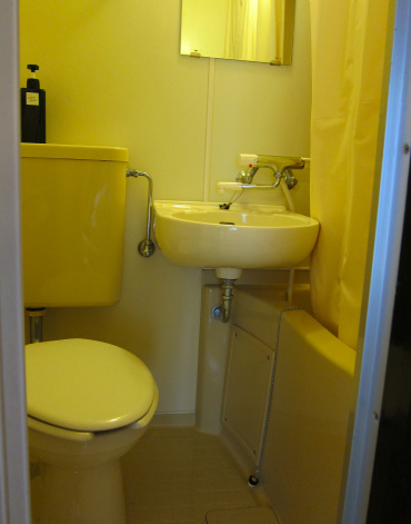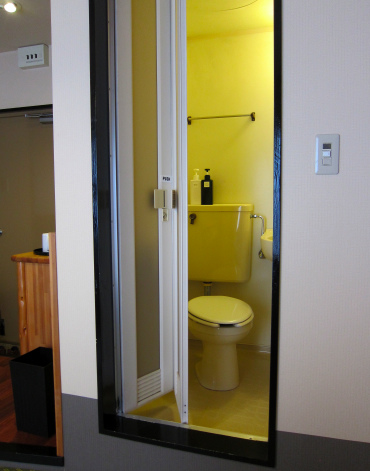 衛浴讓人再次讚嘆日本人對空間利用的極致,這是我見過最小最小的衛浴,小到馬桶座得斜擺以及使用摺疊式拉門,洗臉台將近一半在浴缸上方,和蓮蓬頭共用一個水龍頭,浴缸比以往見過的又更小。身材嬌小的東方人如我們,使用起來已是綁手綁腳,人高馬大的西方人可能會覺得來到小人國。