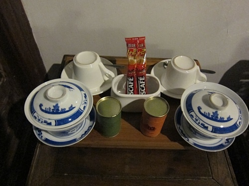 每間房的擺設不盡相同,家具也根據房價高低而有所不同。我們房間呈長條狀,一進門是書桌、衣櫃和羅漢床(鴉片床),傘桶裡貼心的擱了兩把傘,飲品提供兩款茶葉而非茶包頗獨特。午間的陽光暖暖照著羅漢床,多想就這麼躺著曬太陽,哪兒也不去,什麼也不做。下次吧,下次我要在蘇州待上半個月,窩在老宅裡翻翻書或上園林慢慢逛。