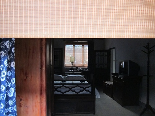 最底是床和電視,比較貴的房型使用八角床。後面也有扇門,外面是個迷你院子,天氣不冷的時候讓門開著通風應該很舒服。樓上若有人走動,木頭天花板會發出聲音。