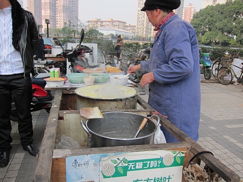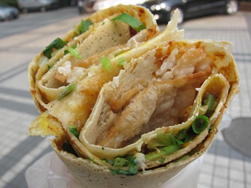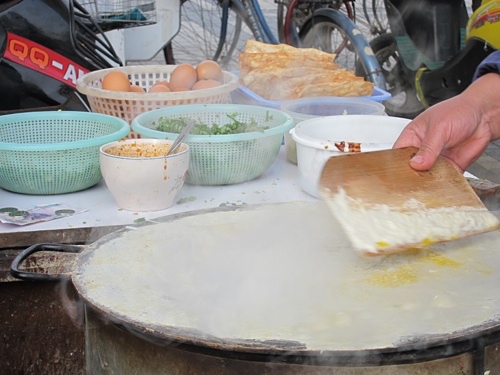 踏出東寶興路站,發現有攤山東煎餅,得來全不費工夫,老早就想吃了,而且看起來挺乾淨的。山東煎餅的作法類似蛋餅,但是口感酥脆,麵糊抹開烙一會後,打顆蛋抹勻和麵皮融為一體,接著刷上醬汁,灑上香菜和蔥花,放一塊脆餅,最後折起便大功告成。很大一份不過10多塊台幣,清爽美味又便宜,當早餐吃很棒,讓我懷念的好滋味。
