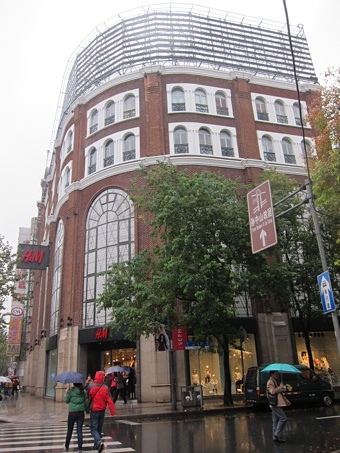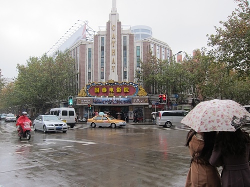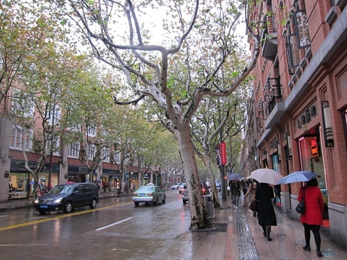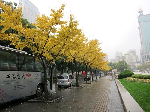 離開美術館,走進人民公園,楓紅披掛水珠,地上落葉片片。茫茫雨霧中,坐在涼亭下的中年男子引吭高歌,我是一隻小小小小鳥,想要飛卻飛也飛不高.....,唱畢感慨地大聲抒發道,中國男人真沒地位,在家太太不准唱歌,還得跑到公園來。我心中狂笑,什麼怪人都有。步出公園,前往國際飯店買蝴蝶酥,接著經過城市規劃館和上海大劇院,人行道的銀杏為灰撲撲的色調增添許多亮麗。