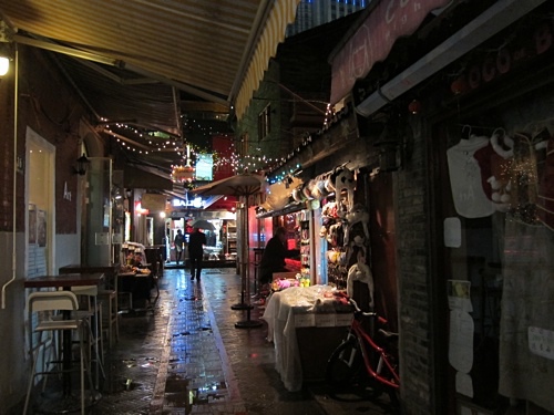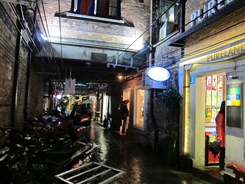 晚上來到觀光客必訪的田子坊,地上的雨水和燈光相互輝映。如今的田子坊是一個價高不可攀,已經逐漸喪失創作精神的集中地,隨意遊走巷弄間,然後離去。