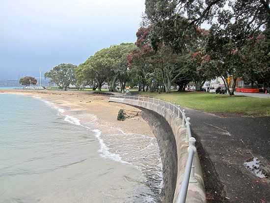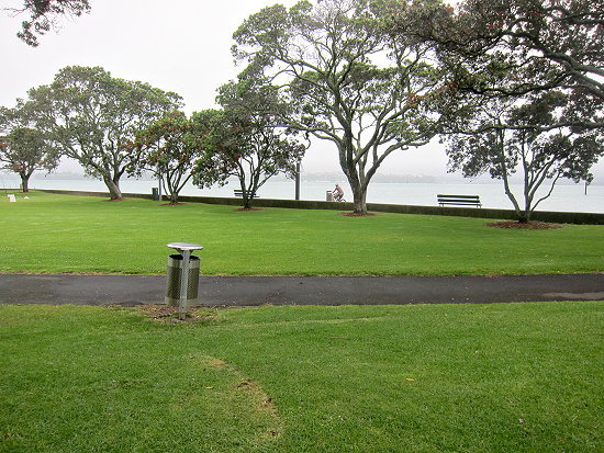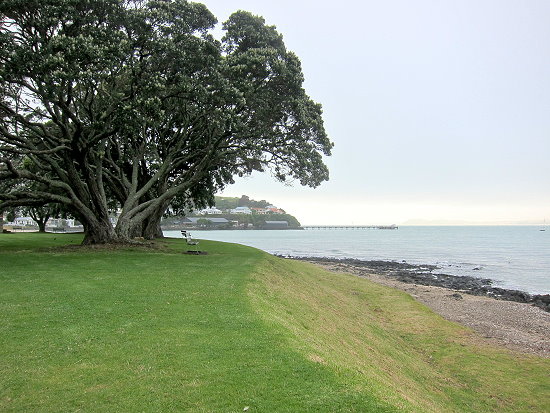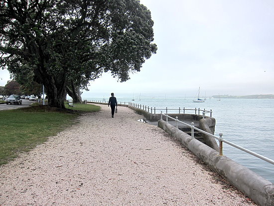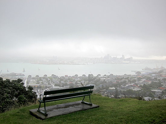 搭車回到市區,然後乘船前往對岸的Devonport,沿著海灣行走。他打算走到Hauraki Gulf Maritime Park,眼見風越來越大,天色漸暗,大雨來臨的前兆,於是轉而爬上維多利亞山。經過半山腰的小學,他說道加拿大一位老師當初來停留一年住在這裡時,小孩就是讀這所學校。不過十幾分鐘船程,Devonport相對於奧克蘭彷彿另外一個世界,寧靜緩慢,單純是住宅區,和一條有著咖啡館和小店的街道。往山頂途中,前來運動和遛狗的居民主動跟我們打招呼。剛爬到頂,緊接著下起大雨來,景色籠罩在雨霧中,不見天空之塔。天氣好的時候,從這裡遠眺市中心的燈火應該不錯吧。