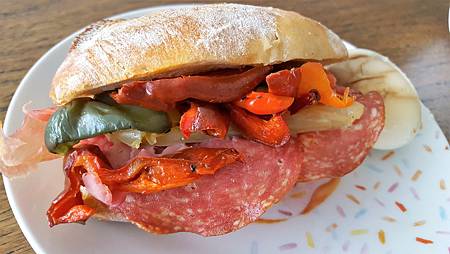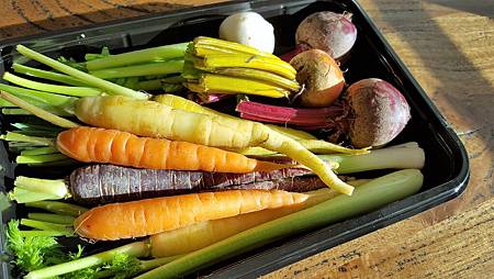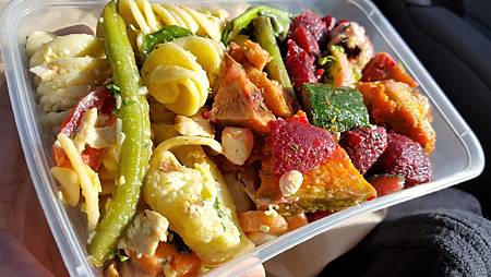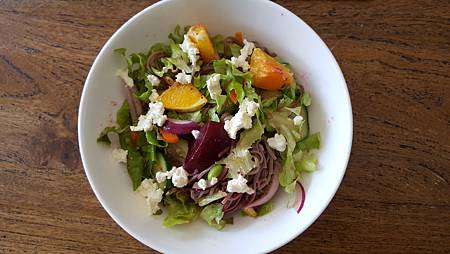 這裡很流行吃麵沙拉,上班族午餐最愛,每天都大排長龍,一般沙拉或飯沙拉也是。自己做一碗,毛豆、紅蘿蔔、櫛瓜、甜菜根、柳橙、生菜、紅洋蔥、麵條、Ricotta起司,芥末籽醬、橄欖油、蜂蜜、檸檬汁,開動!