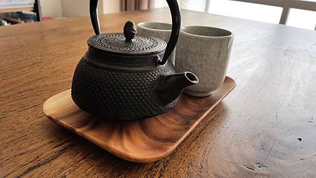 從京都扛回台灣再扛回紐西蘭的鐵壺和對杯,從台灣無印良品買來的木製拖盤,有點小。