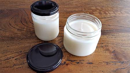 覺得買玻璃容器做蠟燭不環保,把食品空罐的標籤刷洗乾淨,黑色蓋子挺好看的。