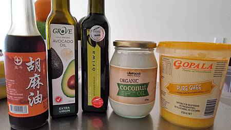 冷壓初榨橄欖油、酪梨油和椰子油,印度酥油(Ghee)、麻油、冰箱裡的奶油,各有不同用途,如果再多瓶鵝油或豬油、葡萄籽油和紫蘇油,就更完美了。這裡買不到好麻油令人扼腕,考慮從台灣偷渡來,亞洲超市實在沒什麼高品質的東西。好想自己開一家雜貨店,專門進口台灣和日本的好東西,連個柚子胡椒都買不到。